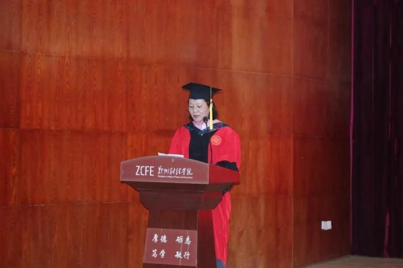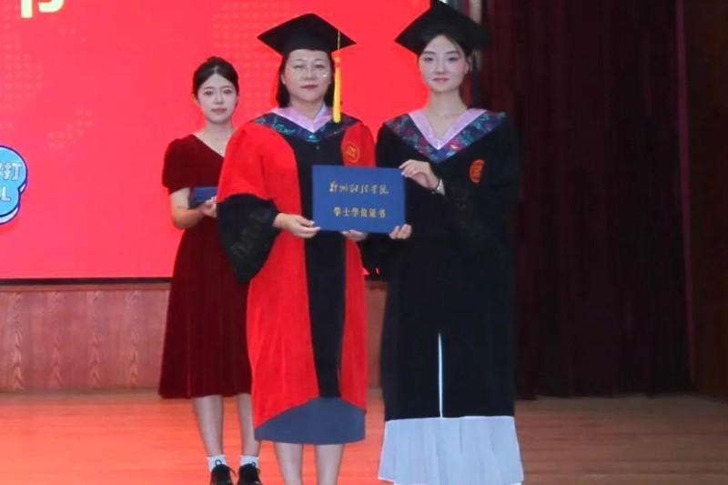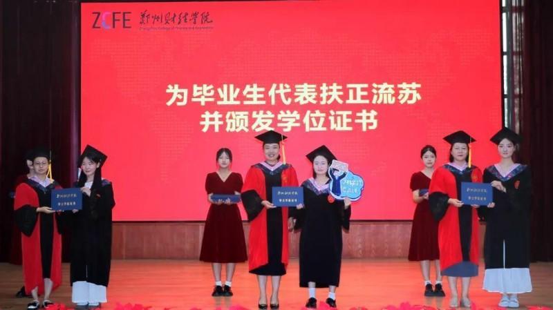 太阳成集团院长管洲、党总支书记温毓敏、副院长张荣静、教研室主任赵欢欢、刘涛、段莎为获得学士学位的毕业生代表扶正流苏、颁发学位证书。